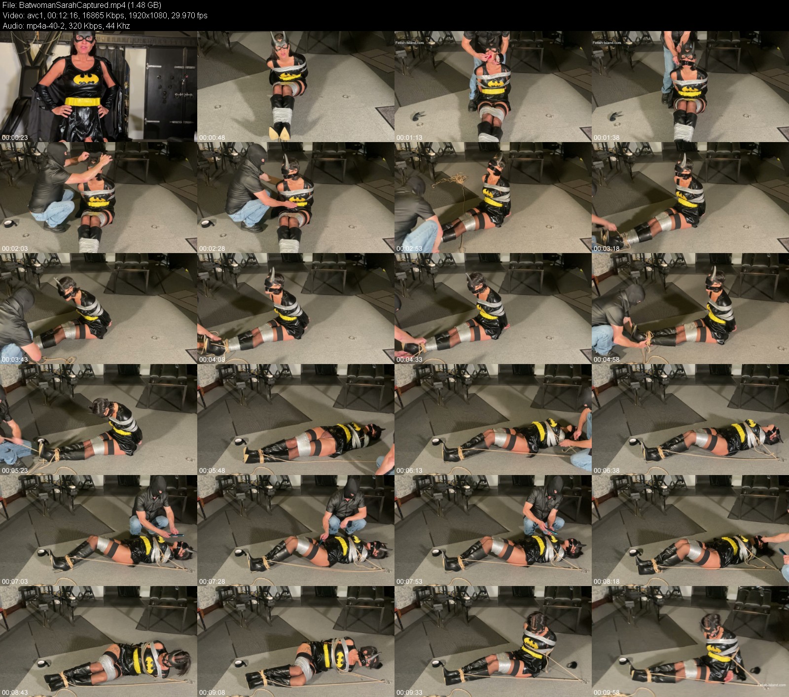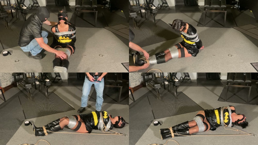 Batwoman Sarah is captured searching the property for the evil villain. Bound and gagged in tape, rope and steel cuffs