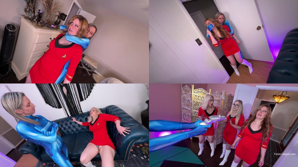 She uses her patented neck pinch, her brutal chop, punches, and even one of the other space babe’s boots while she’s being carried! But something seems strange… it seems like every time she KO’s a gorgeous space-girl, the same exact one shows up again a few minutes later! To confirm her suspicions, she stacks all the lovely unconscious ladies in a single room, and sure enough, there are multiple copies of each! That’s ok, though… more for the collective! She contacts her mothership to have the pile of girls beamed up.