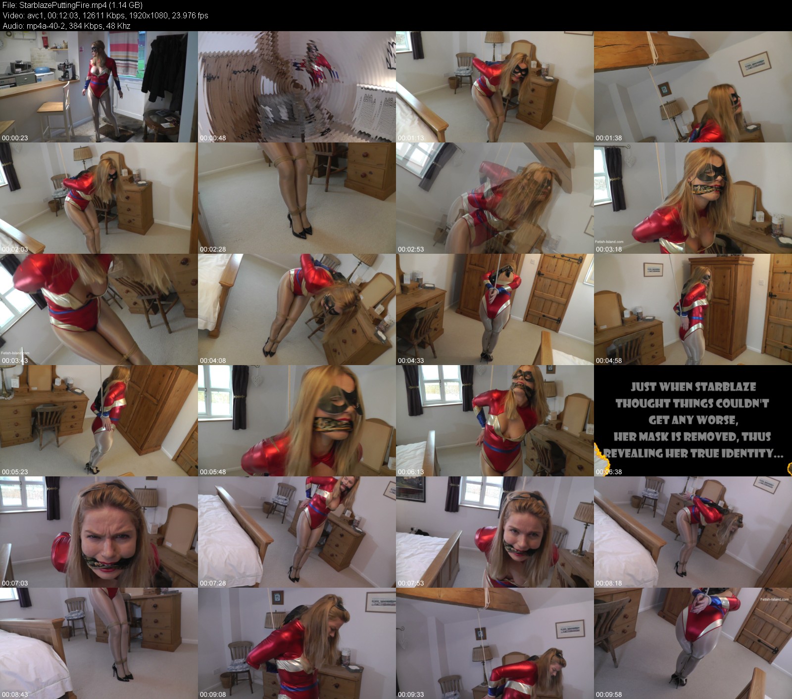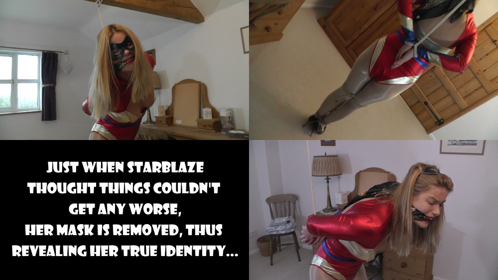 Sometime later, things take a diabolical turn for the worse as her captor slips off her mask, revealing her true identity. Now Starblaze is really in a bind as her captor leaves her alone to struggle endlessly. With her arms pulled up behind her putting the helpless heroine into a devastating strappado, the sexy superheroine can do nothing but grunt and groan as she twists and turns on the spot, utterly powerless to do a thing!