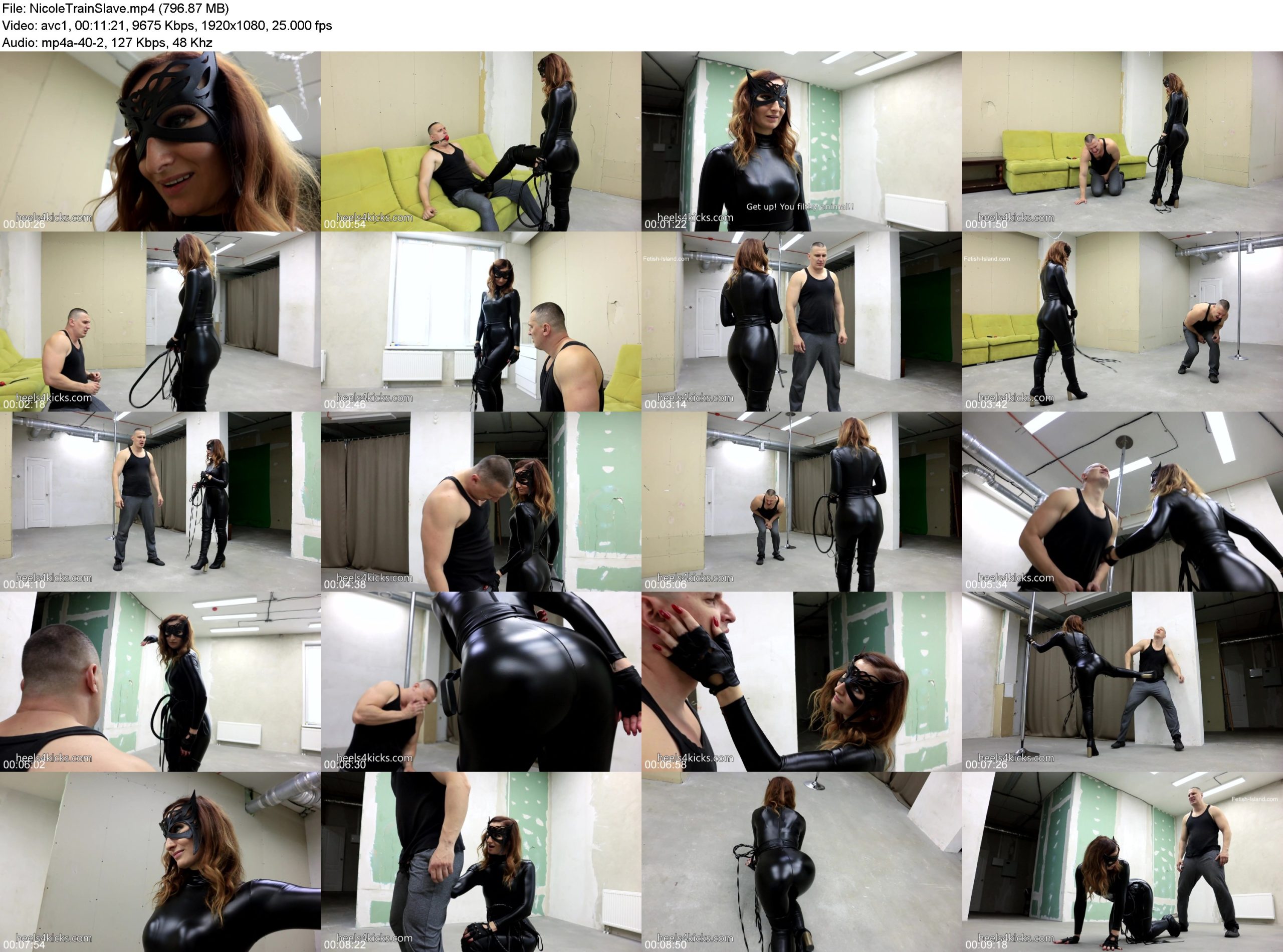 Nicole wearing latex bodysuit and over knee boots is training her slave. She is teasing his balls by kicking, grabbing and stomping them. She use a long whip to hit his body to make him obey. She is crawling in front of him arousing him with her sexy body and thrusting kicks with her high heels into the groin. While this training she also kicks his body and slaps his face to teach him not to talk with her without her permission. Finally she puts her long leather boot to his shoulder making him to kiss it.