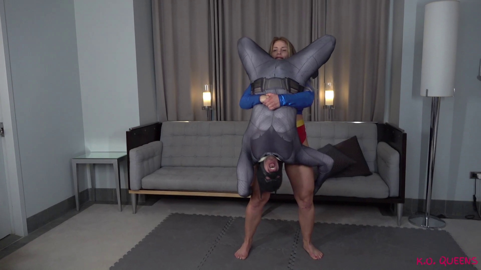 Super Sheens laughs at how effortlessly she inflicts pain on the masked hero as she steps on his balls then sits on his face. She says that instead of kicking him out of “her city” she will use him as her throne! A reverse headscissors adds to the punishment as it looks like the bat has been KOd. She taunts him more then proceeds to take his cape and use it against him! Super Sheena puts his cape on then elbow drops on his back.
