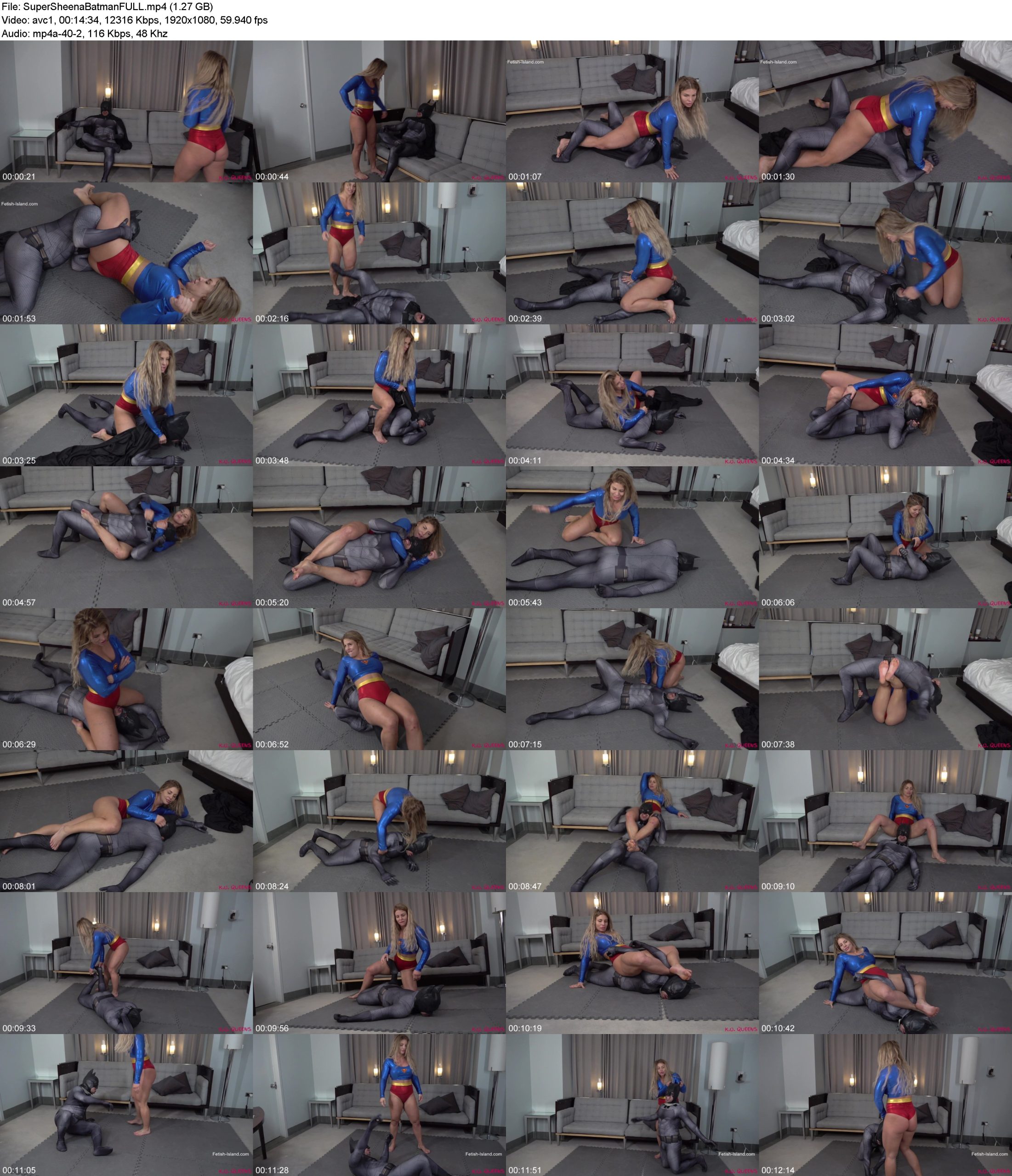 Next up is a figure four leg lock + hand smother, rear naked choke + bodyscissors combo KO, schoolgirl pin, ass smother KO, bow and arrow, headscissor KO, kneeling surfboard, lotus lock, upside down bearhug, and a final rear naked choke KO. Batman never stood a chance-Super Sheena used him for target practice and takes his cape as she leaves him on the floor battered and defeated.