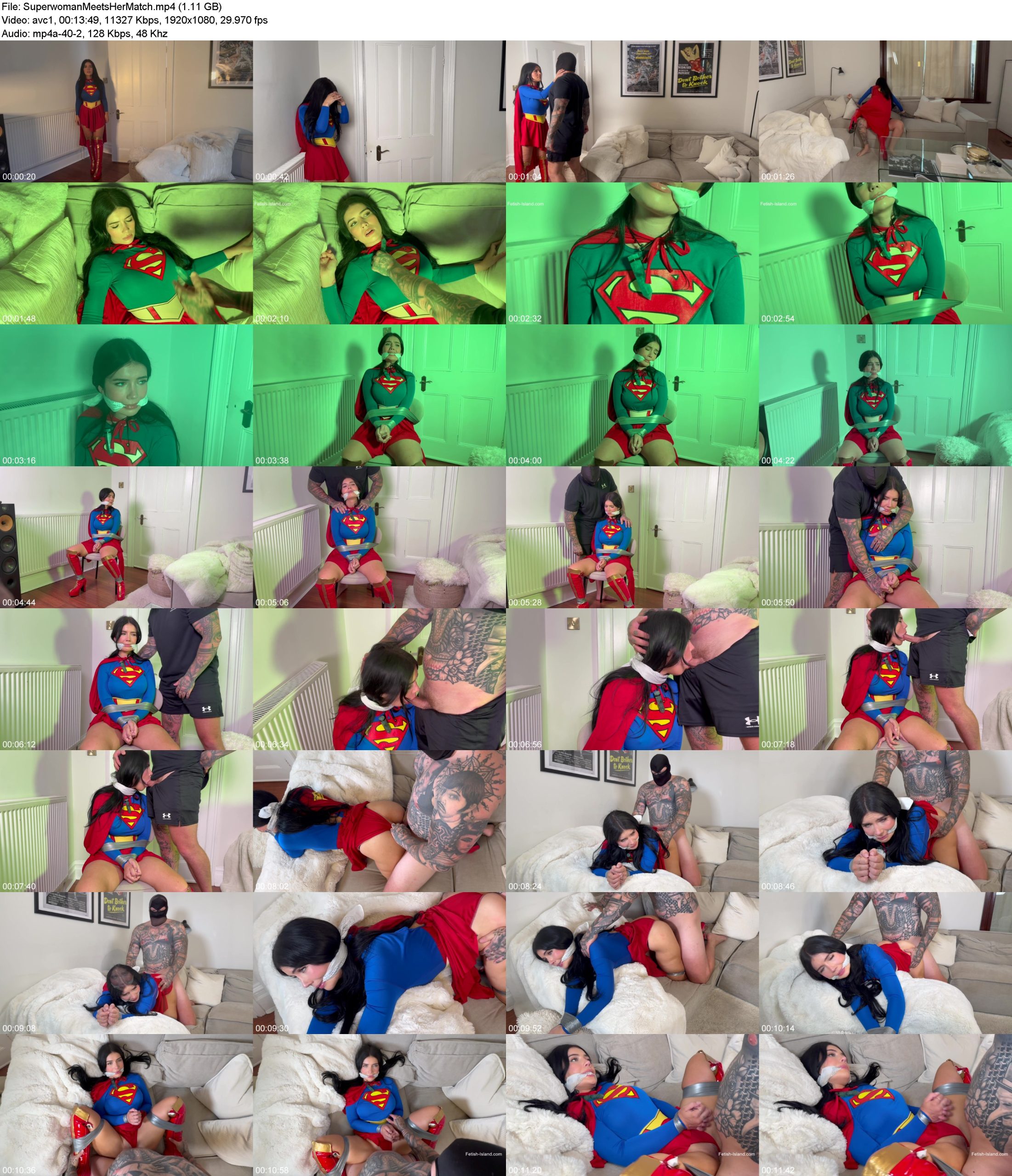 In the darkness, only the green glow of the kryptonite illuminated her. Superwoman couldn’t see the masked man until he switched on a spotlight, flooding the room with light and temporarily blinding her. He approached, his hands groping her huge boobs through her outfit. Lifting Superwoman’s skirt, he revealed her tight red panties and rubbed her juicy pussy lips through the silky fabric.