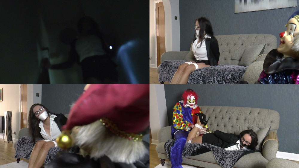 Vickie in business outfit visits the wrong house, gets clown-masked captor who ties her up, gags her with tape and leaves her struggling on the couch.