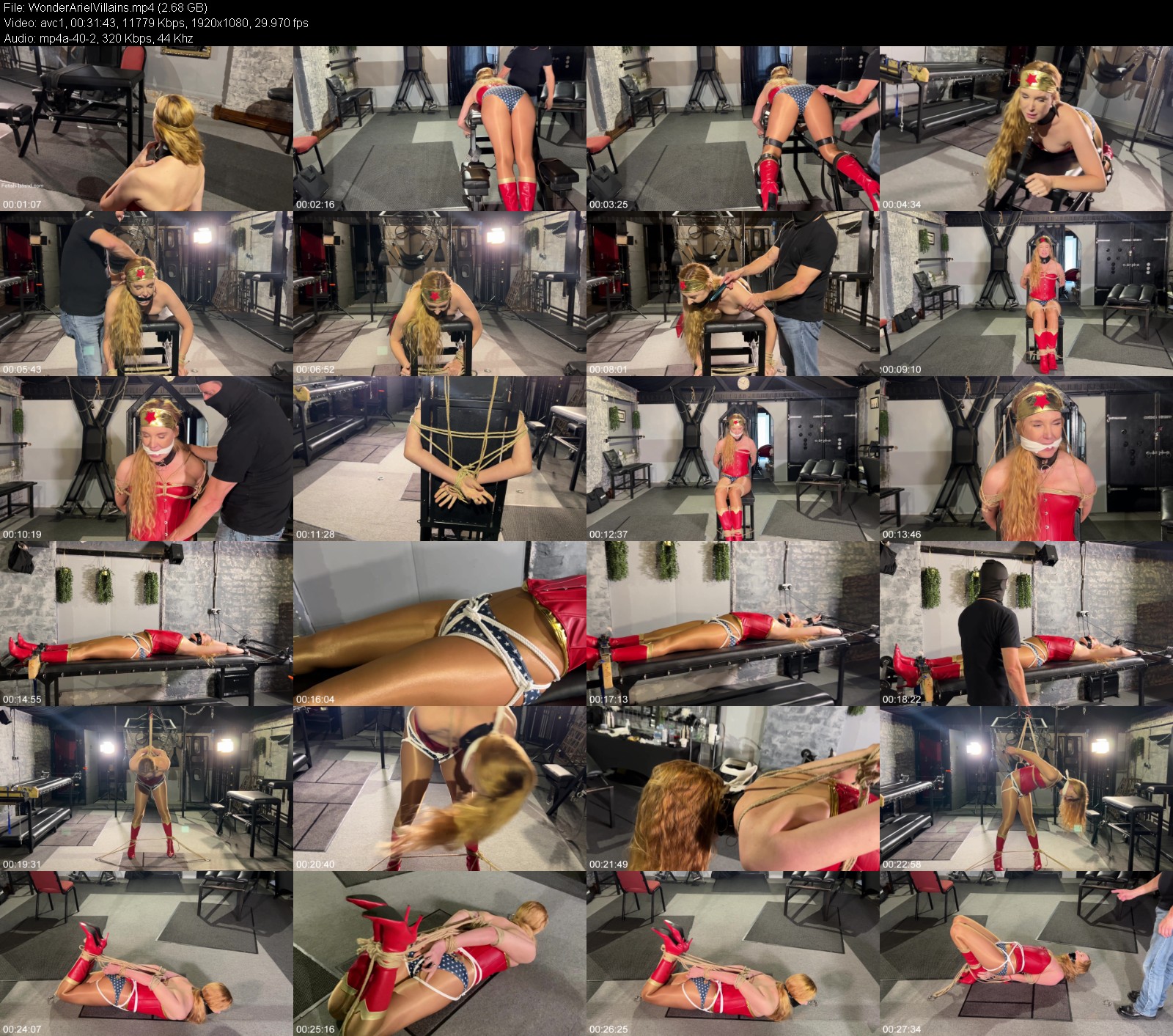 Wonder Ariel enters the Villains dungeon and is captured and rendered powerless by his power sapping collar. Secured to the bench and stuff gagged with a tight cleave gag she struggles to no avail. Tied to a bondage chair with rope and stuff cleave gagged Wonder Ariel struggles in her boots and tight bodice to get free but the Villain has done his work well and keeps her prisoner. Moved to a stretching bench Wonder Ariel is found chained and stretched in her outfit. Crotch roped and pulled to the full extent of her magnificent body. Tied strappado in a secure inescapable rope bondage harness. Legs a stride secured to the rings in the lairs floor. Gagged with stuff and cleave gag. Finally hogtied securely on the floor and in-spite of all her struggles to escape she is shown her future as a chained slave in a harem at some faraway land where she will never be rescued.